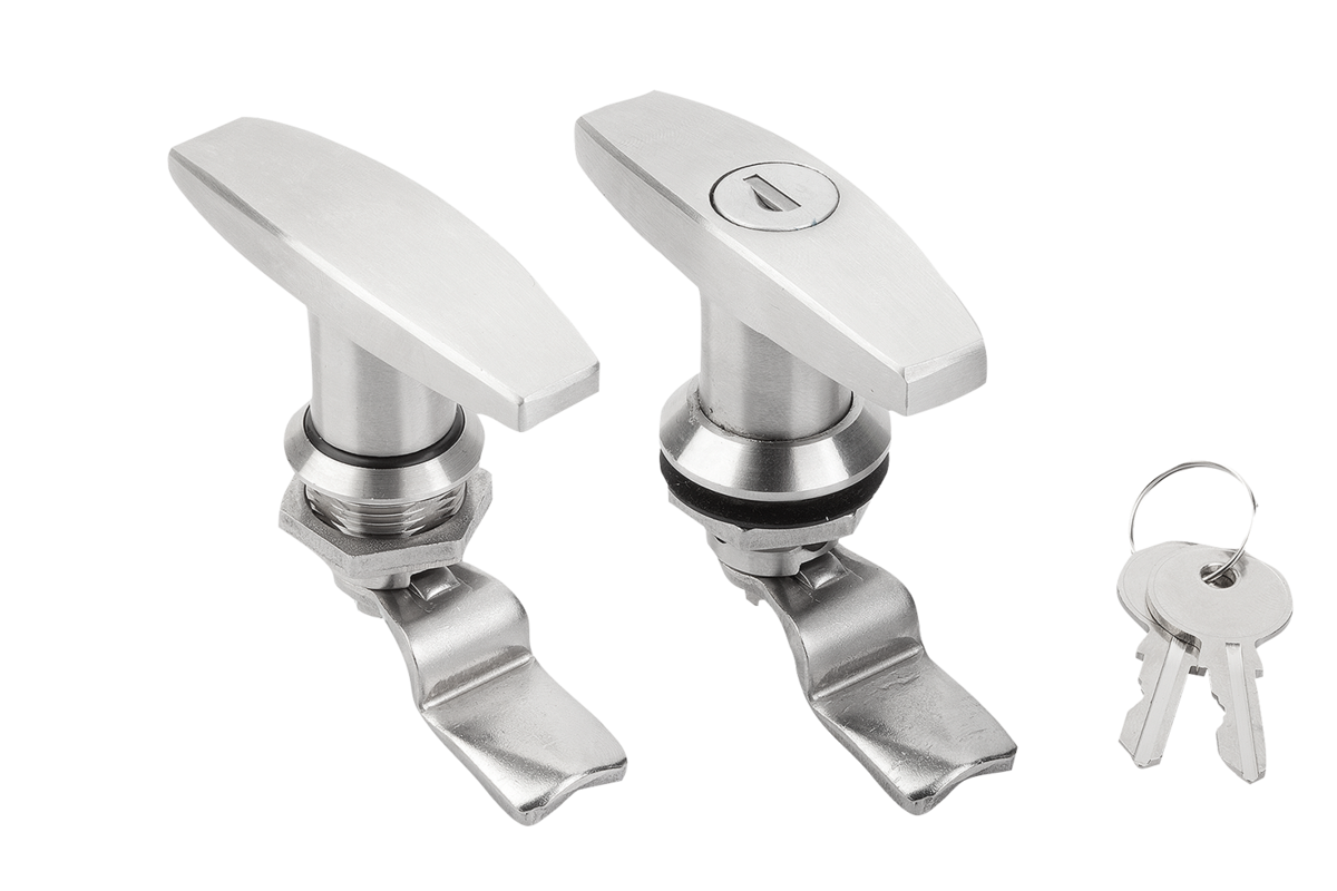 Quarter-turn lock with T-grip. For right or left mounting with 90° closing. The quarter-turn lock can be installed pre-assembled. Supplied with standard stainless-steel nut. The lockable quarter-turn lock is supplied with 2 keys. The key can be removed in both the closed and open position. The cylinder locks have a single-key system i.e. the same key works in all locks (lock type 1333).