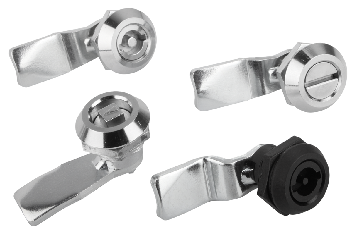Quarter-turn lock with spring-loaded tongue. Right or left deployment. The lock can be installed pre-assembled. The fastening nut is an earthing nut with teeth one side.