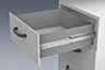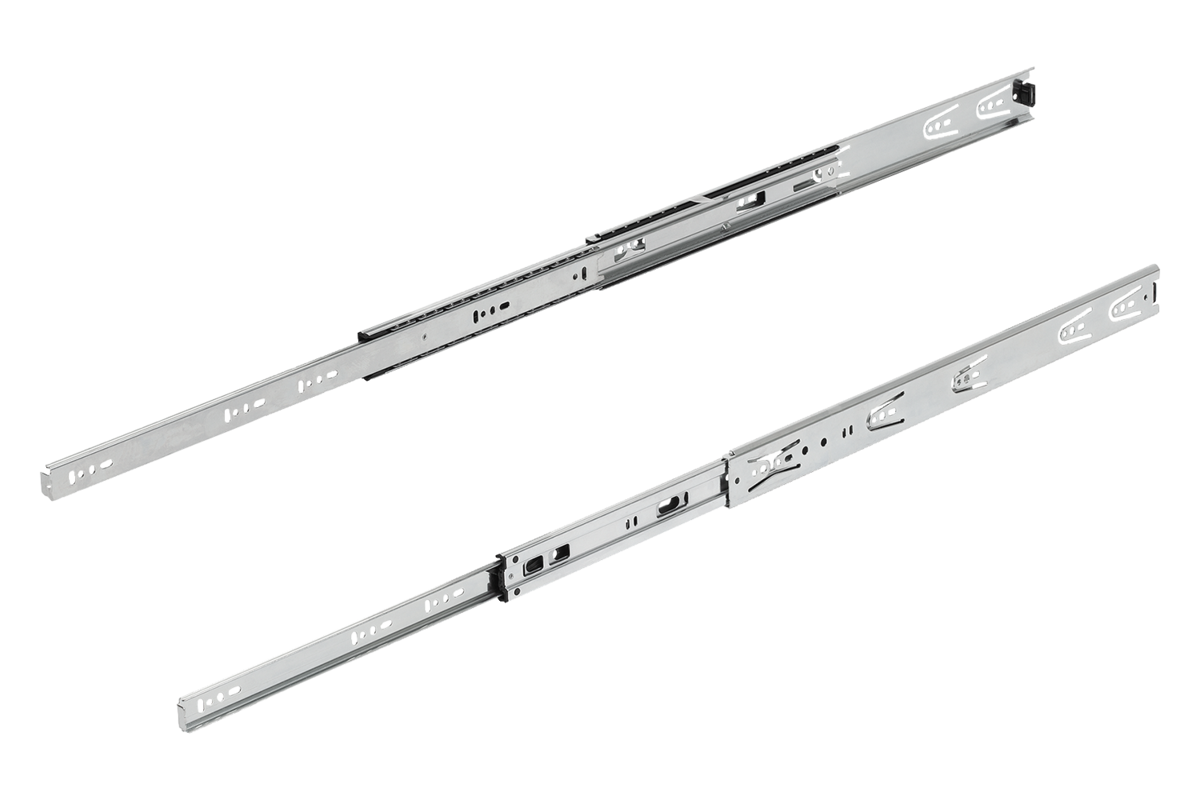 Pour les glissières télescopiques avec extension intégrale, la course est égale à la longueur du rail, ce qui garantit plus de confort et d'accessibilité. Maintien en position fermée. Le tiroir peut être facilement retiré et séparé du rail de guidage en actionnant le levier de déblocage.