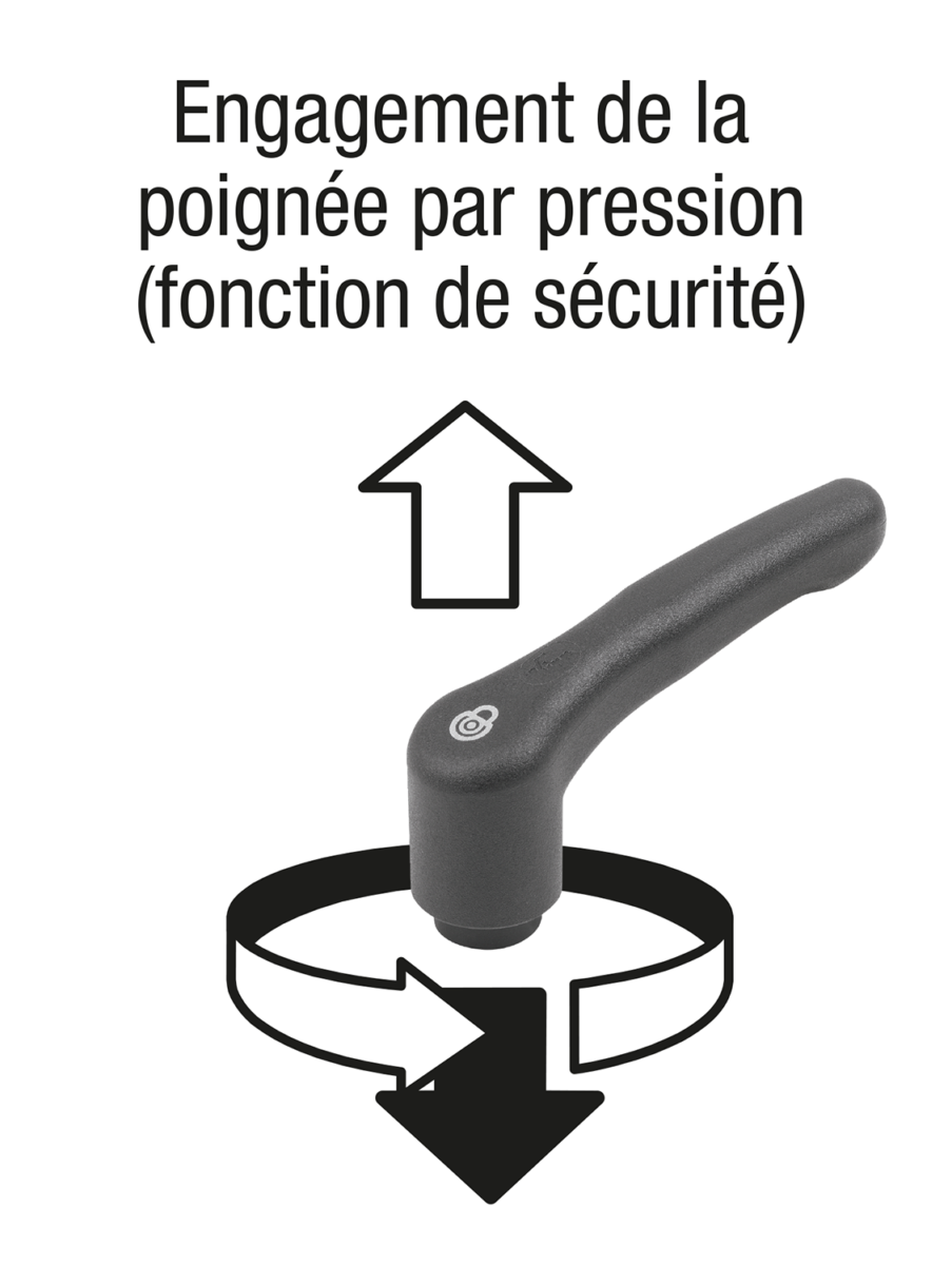 À l'état initial, la manette tourne librement car elle n'est pas enclenchée dans la denture. Ce n'est qu'en appuyant sur la poignée que la denture s'enclenche et que la poignée peut être serrée ou désserrée.