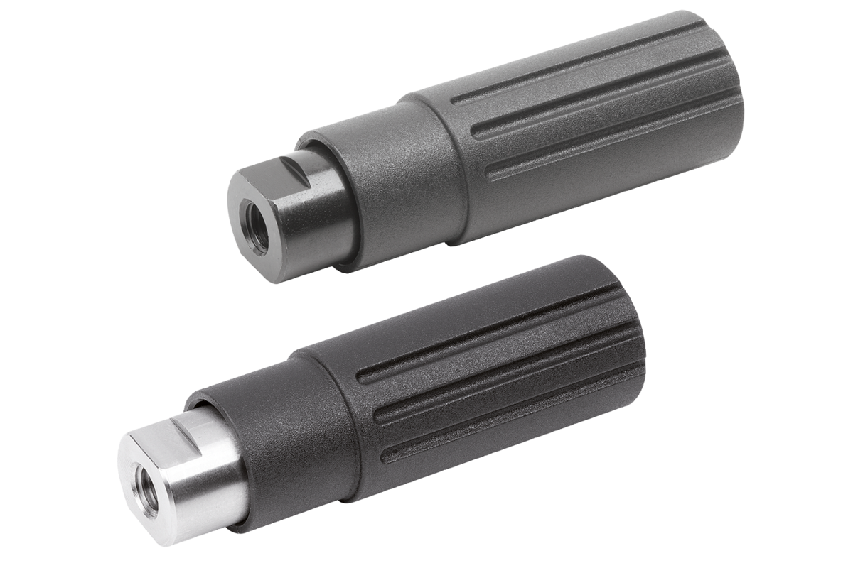 Les poignées cylindriques sont livrées montées et peuvent par ex. être vissées sur des volants, des manivelles ou des dévidoirs.